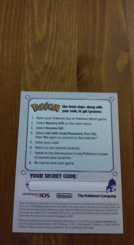 Riguardo a Lycanroc, dalle immagini emerge che il Pokémon sarà distribuito al livello 50, avrà l’abilità nascosta Nullodifesa e terrà una Assorbisfera come strumento. Inoltre, disporrà delle mosse Pietrataglio, Rogodenti, Sbigoattacco e Danzaspada. Per ottenerlo sarà sufficiente eseguire i seguenti passaggi: