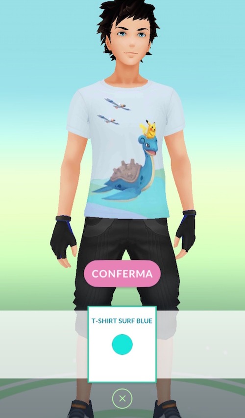 Come già anticipato nel codice dell’ultimo aggiornamento di Pokémon GO, ad accompagnare l’evento c’è la nuova T-shirt Surf Blue: la maglietta mostra un Pikachu seduto sulla testa di Lapras e due Wingull che solcano il cielo.