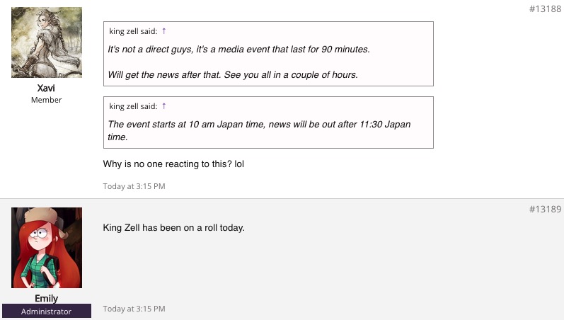 Qualora queste informazioni fossero vere, non sarebbe in ogni caso certo che un annuncio dei videogiochi possa avvenire immediatamente dopo l’evento. King Zell non fa riferimento a un orario e, quindi, diverse ore potrebbero frapporsi tra l’evento e l’effettivo annuncio.