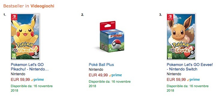Non sono trascorse nemmeno 24 ore dall’annuncio ufficiale di Pokémon: Let’s Go, Pikachu! e Pokémon: Let’s Go, Eevee! della scorsa notte e già la nuova coppia di RPG Pokémon si classifica tra i giochi per Nintendo Switch più venduti stando alla classifica di Amazon USA e anche in Italia.
