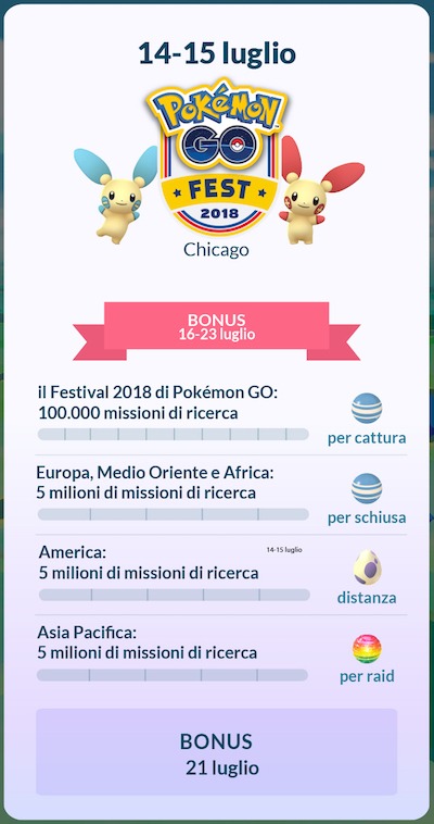Come già annunciato in precedenza, il 14 luglio inizierà la seconda sfida globale del Professor Willow in concomitanza con l’evento del Pokémon GO Fest di Chicago negli Stati Uniti che si svolgerà il 14 e 15 luglio. In ogni area del mondo si dovranno raggiungere gli obiettivi prefissati della sfida. Se ciascuna area conseguirà il proprio verranno sbloccati dei bonus di caramelle ottenibili, per esempio, catturando Pokémon e partecipando ai raid. Gli Allenatori avranno anche la possibilità di sfruttare un ulteriore bonus che ridurrà la distanza da percorrere necessaria per far schiudere le loro Uova! I bonus saranno disponibili dalle ore 22:00 del 16 luglio alle ore 22:00 del 23 luglio.