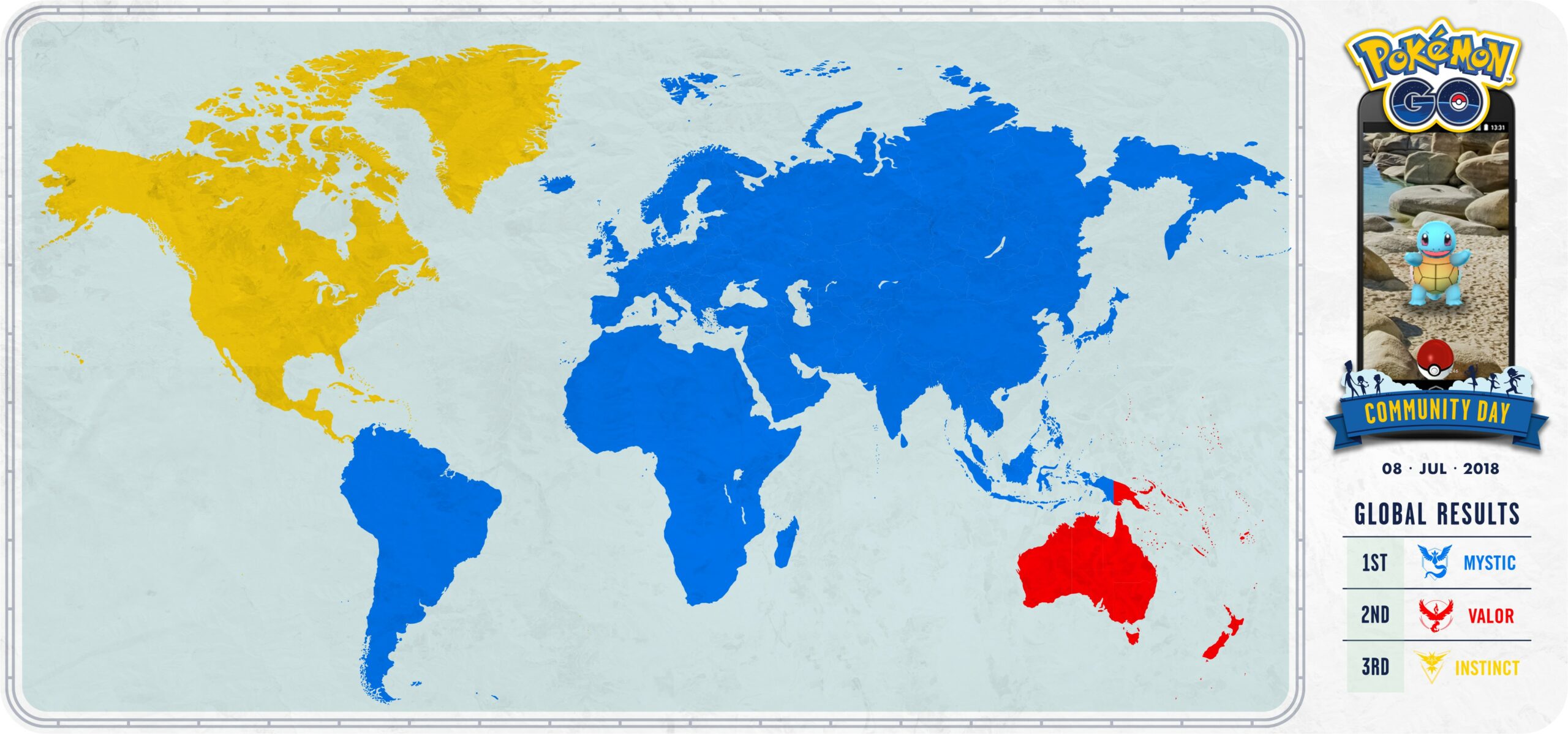 È stato inoltre svelato che il Community Day di luglio è stato vinto dal Team Saggezza che ha catturato il maggior numero di Squirtle. In Nord e Centro America ha dominato il Team Istinto, mentre in Australia e Nuova Zelanda il Team Coraggio.