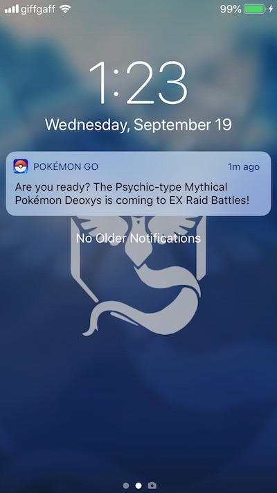 La prima informazione trapelata è arrivata tramite una notifica di Pokémon GO sui dispositivi iOS di molti giocatori in tutto il mondo e riguarda i Raid EX. Il messaggio inviato dice: “Siete pronti? Il Pokémon misterioso di tipo Psico Deoxys è in arrivo nelle lotte Raid EX”.