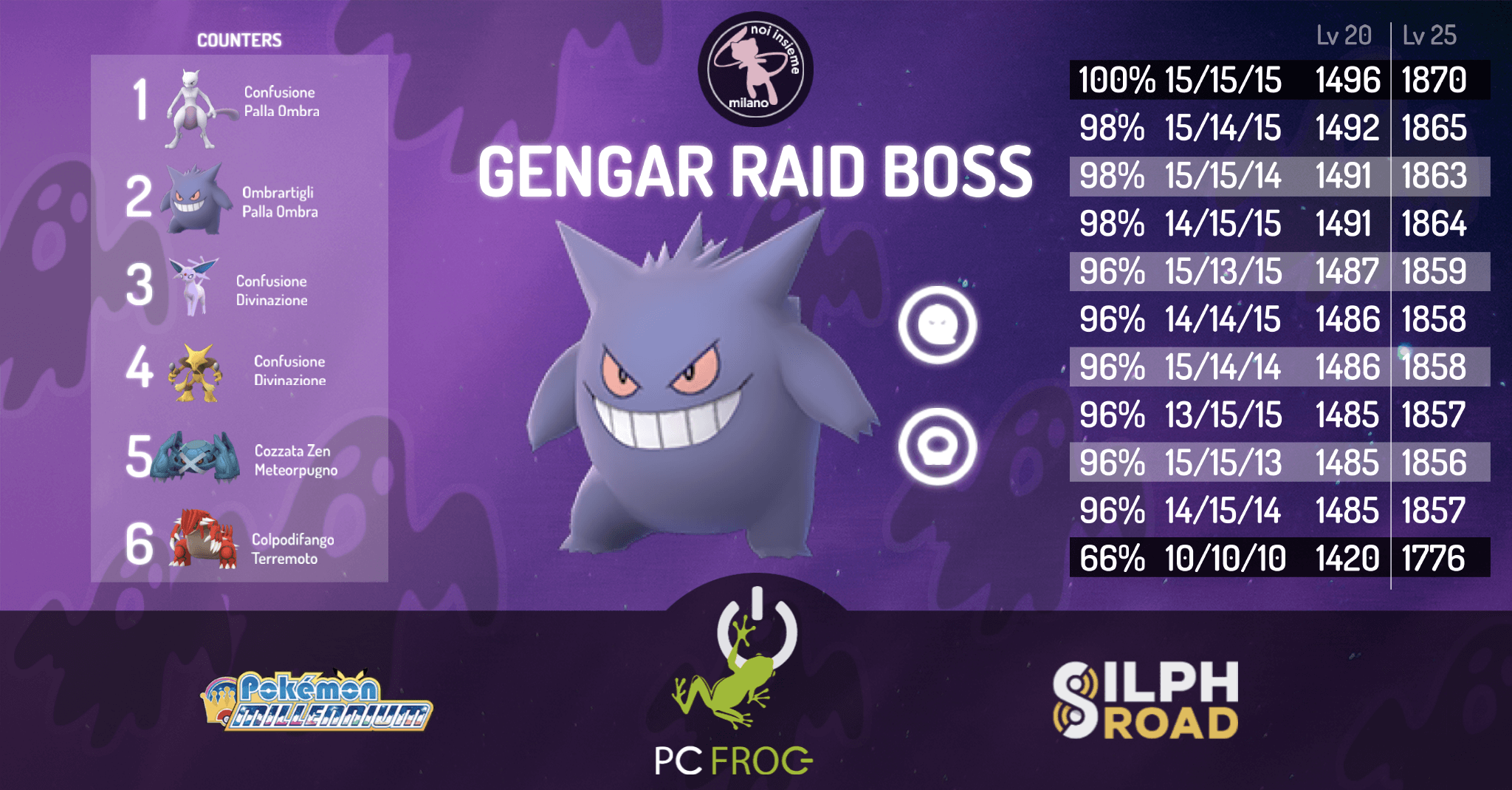 Gengar 100% corrisponderà a 1496 PL mentre il suo estremo opposto, il 66%, sarà dotato di 1420 PL. Se il meteo nel gioco sarà Coperto o Nebbia il Pokémon Ombra risulterà potenziato rispetto al normale e si troverà al livello 25. In questo caso i suoi valori saranno di 1870 PL al 100% e di 1776 PL al 66%.