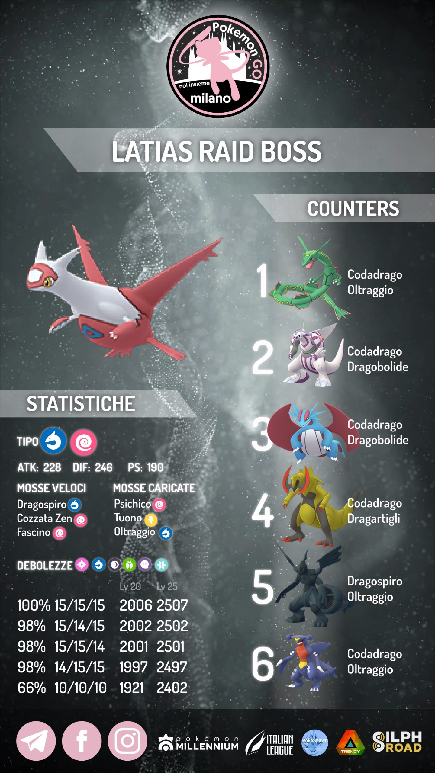 Latias si presenta come un Pokémon abbastanza difficile da affrontare, a causa della sua ottima statistica di Difesa e alla quantità elevata di Pokémon che metterà fuori combattimento in battaglia. Anche se dovesse avere mosse di tipo Drago, è comunque consigliabile utilizzare Pokémon di tipo Drago che risultano i migliori da schierare. Il consiglio è quello di potenziare Rayquaza e gli altri attaccanti almeno a livello 30 e di affrontarlo in 5/6 giocatori per portare a termine l’impresa senza troppi problemi.