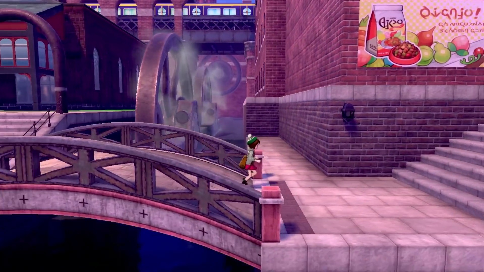 Altre scritte le troviamo nella città in piena rivoluzione industriale. Qua si tratta soprattutto di cartelloni pubblicitari e insegne di negozi, come si può vedere dall’immagine che si trova alle spalle di Shigeru Ohmori, il Game Director di Pokémon Spada e Pokémon Scudo. In uno di questi cartelloni possiamo vedere molte delle bacche ben note a tutti gli Allenatori. Che si tratti di un nuovo snack per i Pokémon?