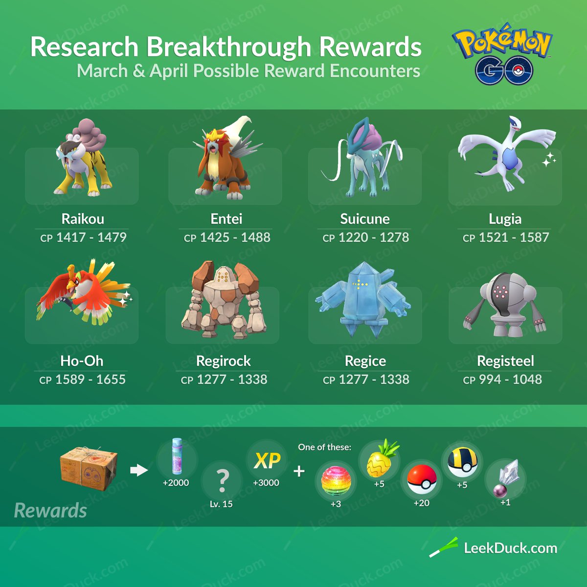 Raccogliendo i sette timbri, ottenibili giornalmente, sarà possibile sbloccare una scoperta straordinaria che dal 1° marzo alle ore 22:00 conterrà un leggendario scelto casualmente tra Regice, Registeel, Regirock, Lugia, Ho-Oh, Entei, Raikou e Suicune. Questi Pokémon saranno ottenibili fino al 1° maggio alle ore 22:00.