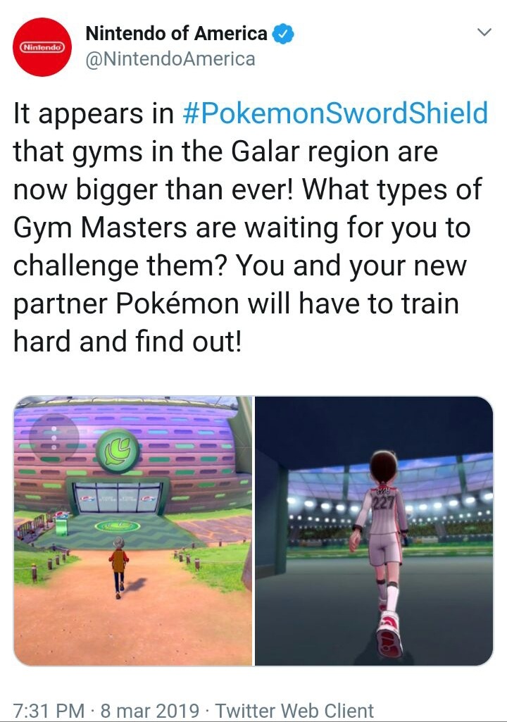 In molti, dopo aver visto il trailer di Pokémon Spada e Scudo diffuso durante il Pokémon Direct del 27 febbraio e dopo aver consultato la mappa ufficiale della regione di Galar, avevano ipotizzato che gli stadi fossero i nuovi edifici ospitanti le Palestre Pokémon. Nel tweet incriminato di Nintendo of America, si fa menzione proprio alle Palestre “adesso più grandi che mai“, con allegate le immagini degli stadi mostrati proprio nel trailer. Insomma, che la conquista delle Medaglie fosse collegata agli stadi era intuibile, ma almeno adesso è arrivata una conferma ufficiale nonostante la cancellazione del tweet.