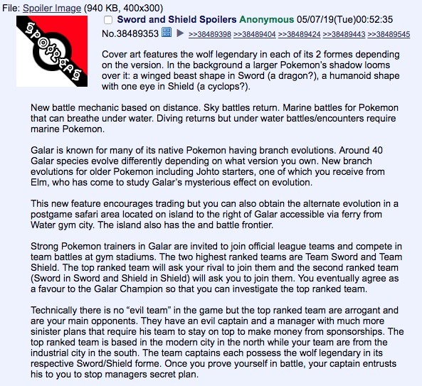 Secondo quanto riportato in un misterioso post apparso qualche ora fa sul noto portale di 4chan, sembrerebbe che con Pokémon Spada e Scudo verranno introdotte tante interessanti novità. Si tratta però di informazioni, quelle che vi stiamo per rivelare, lasciate da un utente in forma del tutto anonima, e vanno di conseguenza trattate alla stregua di ciò che sono: semplici rumor.