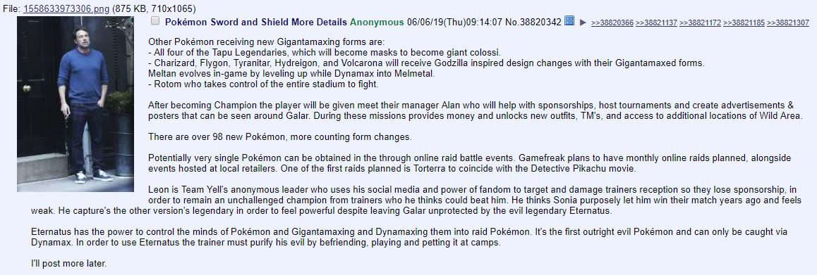 Ci sono già numerosi dettagli non ancora verificati nel leak del 23 maggio, come la presenza di un certo Team Yell, una meccanica parallela al Dynamax chiamata Gigantamax e la minaccia di un Pokémon leggendario malvagio chiamato Eternatus; informazioni delle quali siamo ancora in attesa di capire la loro veridicità. Nel post del 6 giugno, il presunto leaker cerca di ampliare proprio questi dettagli in maniera abbastanza credibile. Tuttavia, c’è da considerare che chiunque potrebbe fingersi chiunque su una board anonima. Prima di capire se si tratti della stessa persona, analizziamo punto per punto i vari dettagli del rumor.