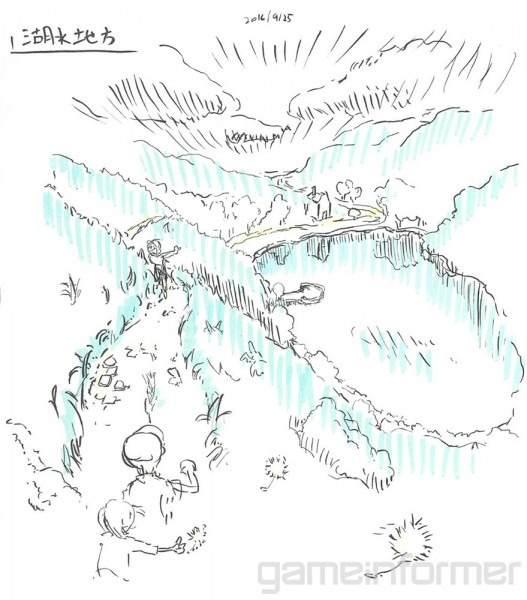 James Turner ha creato i primi due disegni che mostrano i paesaggi presenti all’inizio della storia. I modelli 3D sono stati sviluppati seguendo queste e altre illustrazioni dell’art director. La tinta pastello è stata resa anche nel gioco finale. La terza immagine è un bozzetto di Shigeru Ohmori che mostra il nuovo Pokémon Center; è stato disegnato durante il periodo pre-lancio di Pokémon Sole e Luna.