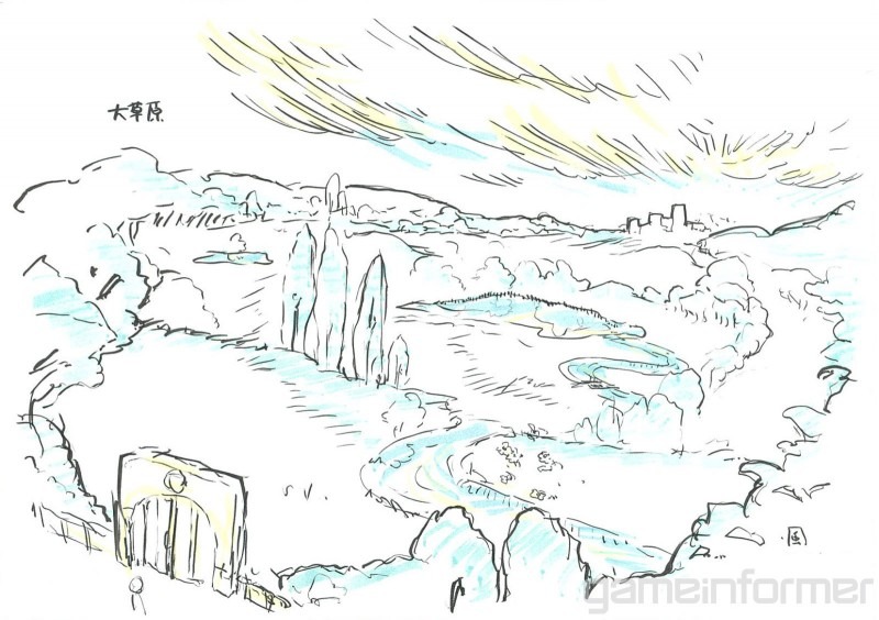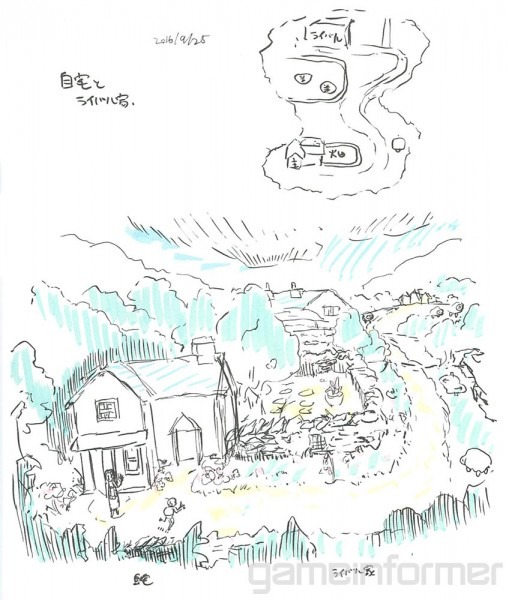 Infine tre bozzetti di Shigeru Ohmori creati durante i suoi viaggi di lavoro in Gran Bretagna. I disegni sono stati di ispirazione rispettivamente per Gossifleur, la città del protagonista e per le Terre Selvagge.