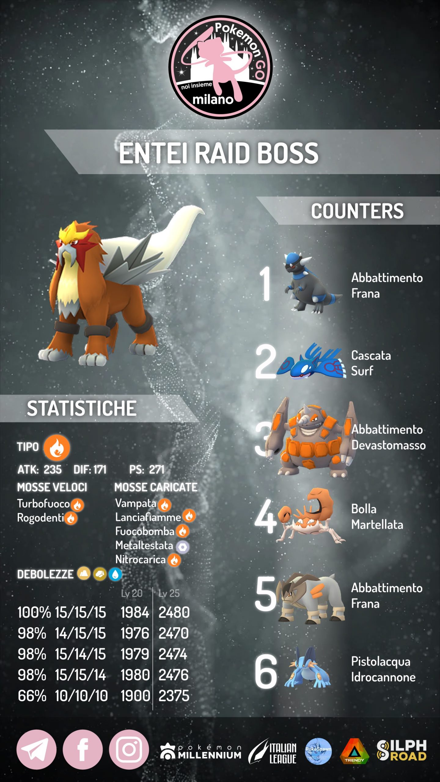 Entei si presenta come un Pokémon facile da affrontare, infatti basteranno 3/4 giocatori per portare a termine l’impresa senza troppi problemi. In 2 risulta più difficile portare a termine l’impresa a patto che ci siano le condizioni descritte precedentemente. Il consiglio è quello di affrontarlo in 4/5 giocatori e potenziare Rampardos, Kyogre e gli altri migliori attaccanti almeno al livello 30.