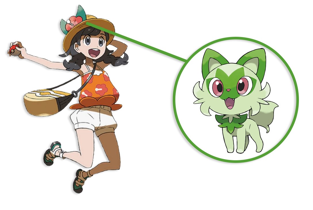Selene, la protagonista femminile, nel suo outfit di Pokémon Ultrasole e Ultraluna porta sul cappello un ibisco i cui colori rievocano quelli degli occhi di Sprigatito; la forma delle foglie, invece, è molto simile al manto che il Pokémon Erbagatto ha sul collo.