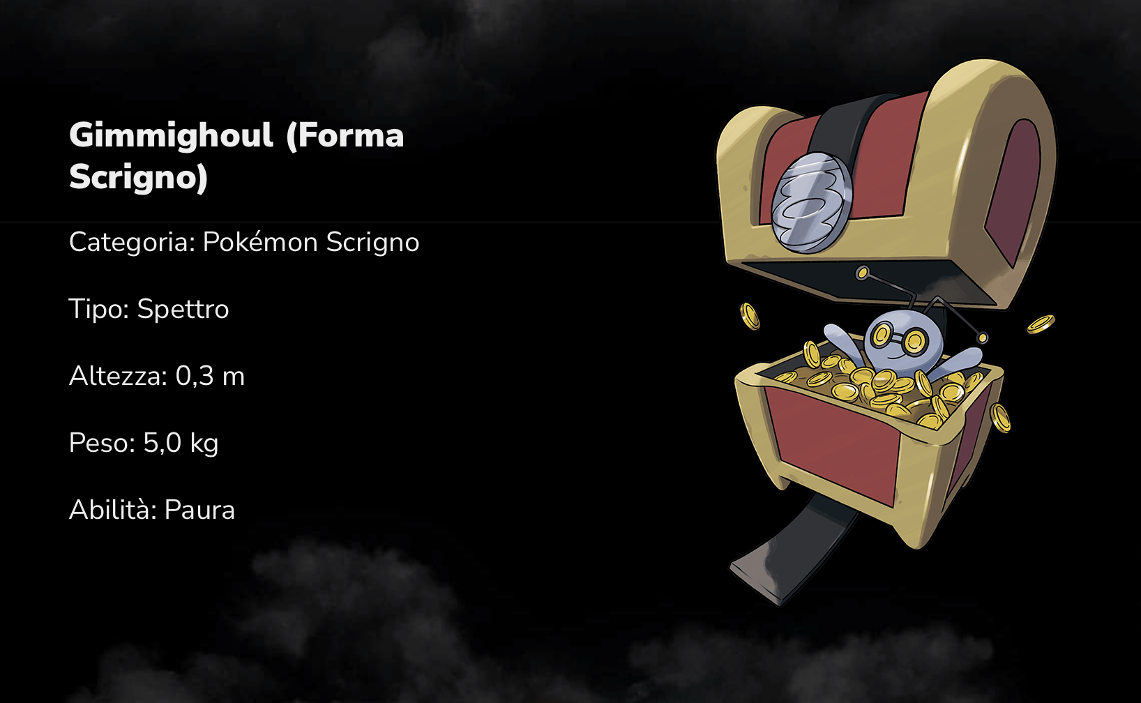 Il nuovo Pokémon è stato rivelato oggi dopo un teaser molto particolare che vedeva la presenza di un misterioso scrigno aperto e che si riempiva di monete. Il piccolo Gimmighoul assomiglia ad un insetto con una moneta sulla schiena e per poterlo ottenere in Pokémon Scarlatto e Violetto dovremo per forza far interagire i giochi anche con Pokémon GO. Possiede inoltre due forme, nella prima denominata Forma Scrigno è di tipo Spettro e possiede l’abilità Paura mentre non si hanno ancora abbastanza dati per la così detta Forma Ambulante.