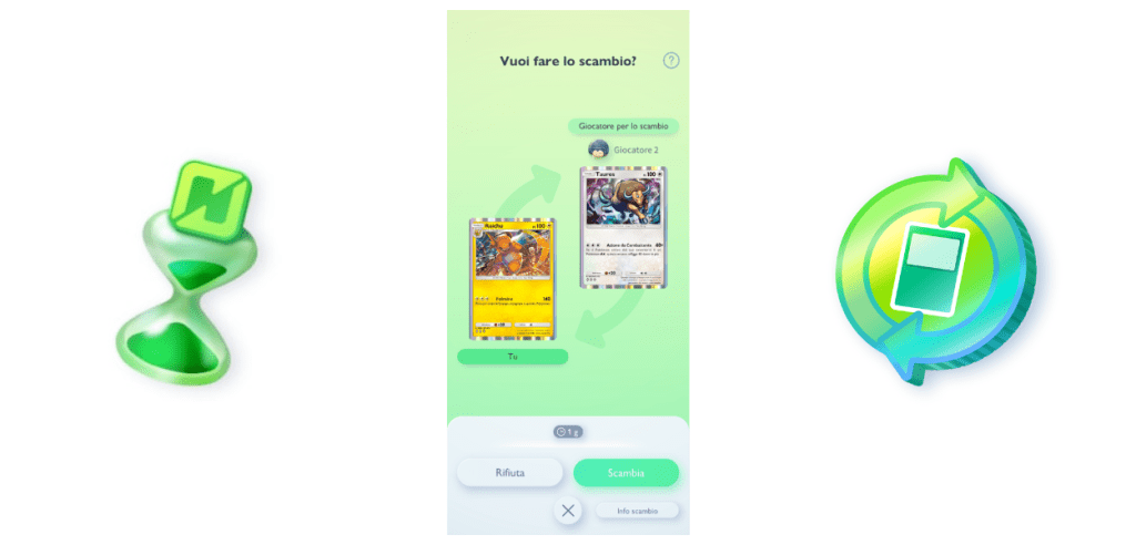 Dal 29 gennaio 2025, invece, il gioco si arricchisce con una nuova funzione, già annunciata nelle scorse settimane: gli scambi. Per effettuare gli scambi sono necessari due nuovi strumenti, le Clessidre scambio e i Gettoni scambio, per poter scambiare carte con rarità da ♦ a ♦♦♦♦ e ★ con carte della stessa rarità.