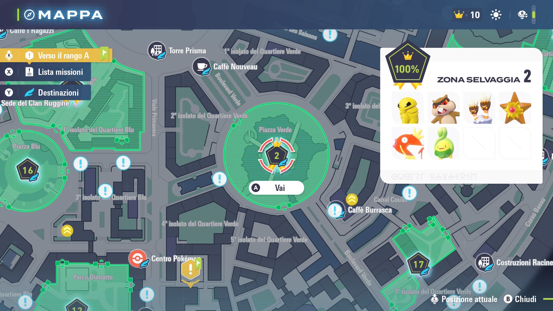 Dopo aver scelto un’area nella quale cercare i cromatici ed essercisi recati per un primo sopralluogo, bisognerà aprire la mappa di Luminopoli con il tasto “+” e selezionare con l’analogico o la Zona Selvaggia in questione oppure un punto d’interesse vicino, come nell’immagine il Caffé Burrasca.