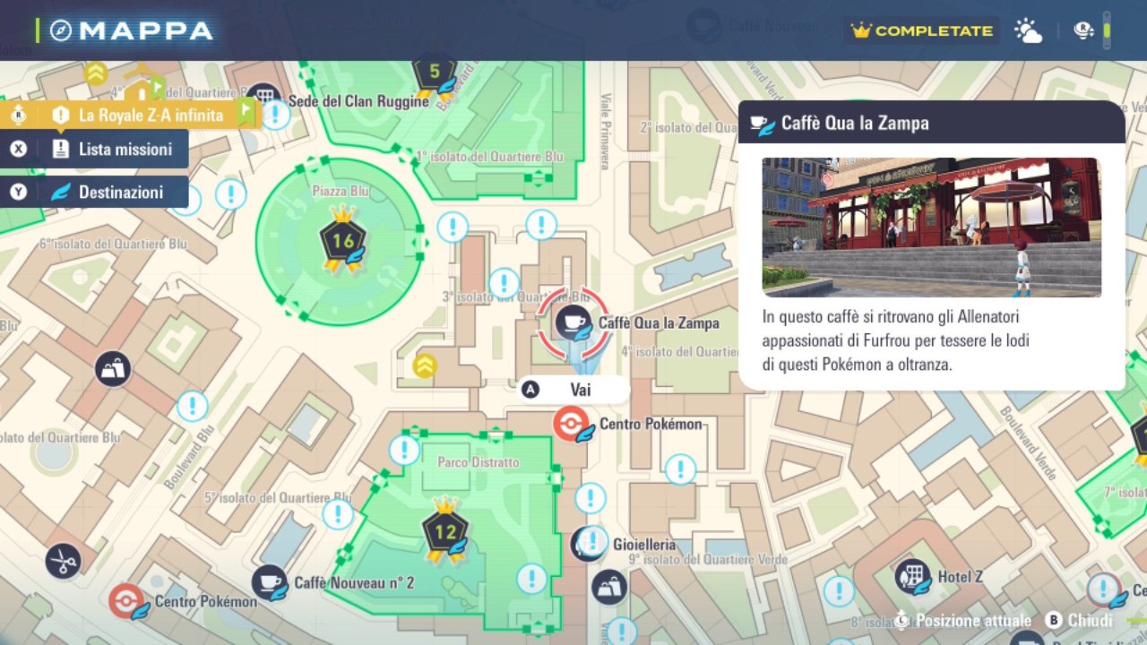 Dirigetevi tramite viaggio rapido al Caffè Qua la Zampa, all’interno del 3° isolato del Quartiere Blu, ed osservando la Minimappa potrete notare una stradina tra due palazzi: andando lì in mezzo, se incrociate un’Allenatrice con un Audino al fianco sapete di essere sulla strada giusta. Alla destra dell’Allenatrice ci sarà una scala che, salendola e girando subito a sinistra, vi porterà davanti a una rampa bloccata da della Melma: qui entra in gioco il vostro Pokémon che, con la mossa insegnata, dissolverà il cumulo. (Se volete saperne di più su come eliminare gli ostacoli nelle strade cliccate questo link)