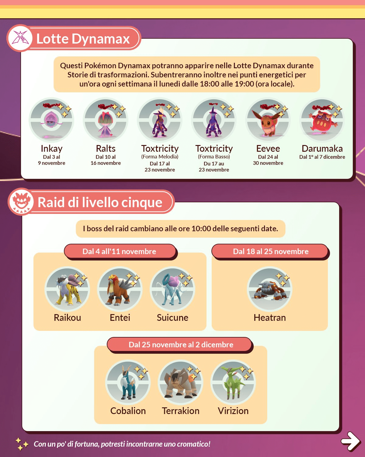 • Dal 21 al 24 novembre: Weekend lotte Dynamax dedicato a un Pokémon Dynamax;