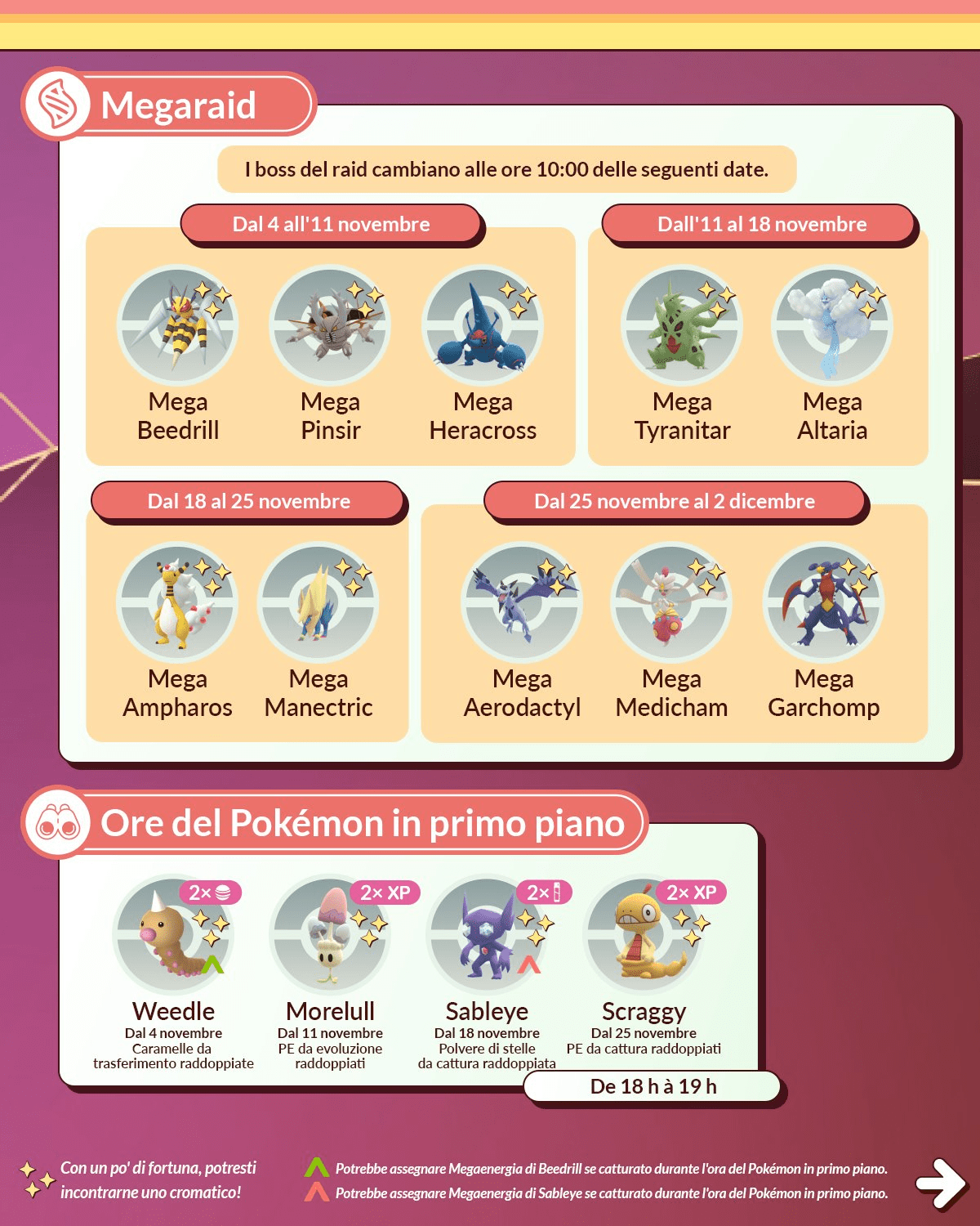 • Dal 4 all’11 novembre: Raikou, Entei, Suicune, Mega Beedrill, Mega Pinsir, Mega Heracross;