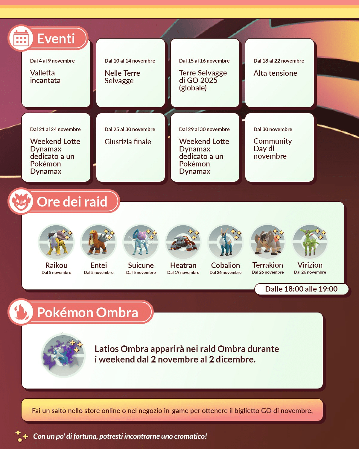 Sono stati annunciati da Niantic tutti gli eventi di novembre 2025. Continua la stagione Storie di trasformazioni, che ha avuto inizio alle 10:00 del 2 settembre e si concluderà alle 10:00 del 2 dicembre 2025.