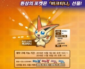 Fino al 30 novembre 2016, infatti, gli Allenatori coreani che preordineranno almeno un gioco a scelta fra Pokémon Sole e Luna riceveranno un codice seriale che permetterà loro di ricevere in dono il Pokémon Vittoria!