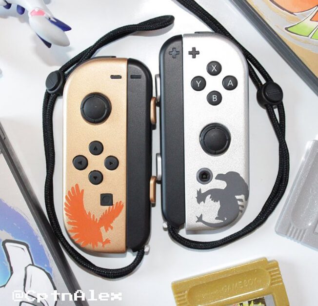 I Joy-Con sono stati dipinti d’oro e d’argento, con le ombre dei due Pokémon Leggendari di copertina che sembrano accompagnare il giocatore come spiriti guida dagli immensi poteri. Lugia e Ho-Oh sono raffigurati come sagome, una arancione e l’altra nera, in una tonalità che si adatta perfettamente allo sfondo studiato per ognuno di loro.