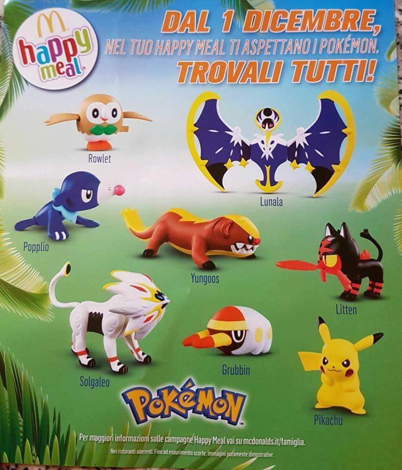 salve, ma le statuine di Pikachu e Yungoos (soprattutto chi e di palermo) che distribuivano tra il 15 e il 21 li anno distribuiti negli Happy meal? io ci sono andata durante la settimana (mi pare giorno 20) e avevano o Litten o Grubbin, vorrei sapere se anche voi avete trovato questi o no. Soprattutto quelli, se ce qualcuno XD, che e di Palermo. Cosi so se e perchè non gli sono arrivati nei mc le statuine o perchè sono finiti. E o il dubbio che non sono arrivati, perchè quando son arrivata li o visto che avevano messo un cartellino(dove si vedono tutte le statuine) con scritto che ci sono quelli precedenti senza specificare se quelli di quella settimana erano finiti o no...