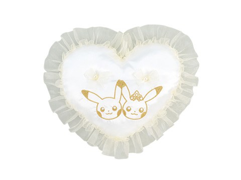 Subito dopo gli sposi, in ordine di importanza, non possono che esserci gli anelli! Saranno disponibili sia gli anelli di fidanzamento che le fedi nuziali. I primi sono stati realizzati sia in oro giallo da 18 carati, sia in platino. Il design però non cambia: due code di Pikachu (una maschile e una femminile) si incontrano toccando un diamante in cima. Le fedi sono meno appariscenti e seguono un design ispirato a una Poké Ball. Sono quasi identiche, con l’unica differenza che la prima presenta un cerchio opaco al centro, mentre nella seconda il cerchio è brillante. Le fedi sono accompagnate da un cuscinetto a forma di cuore, decorato in modo sfarzoso, che presenta il ricamo di una coppia di Pikachu.