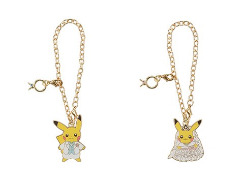 Cosa non può mancare in un matrimonio? Gli sposi, chiaramente! Ecco quindi una coppia di Pikachu: lo sposo indossa un elegantissimo completo bianco con camicia azzurra, papillon coordinato e un bellissimo fiore all’occhiello color pesca. Lo stesso fiore è proposto anche nel bouquet della sposa che indossa un vestito classico e voluminoso. In testa, oltre al velo, porta anche una tiara con sopra un fiocchetto! Non passano poi inosservati gli accessori: una collana di perle coordinata ai bracciali. Questi peluche sono venduti in coppia e sono anche disponibili sotto forma di di portachiave!