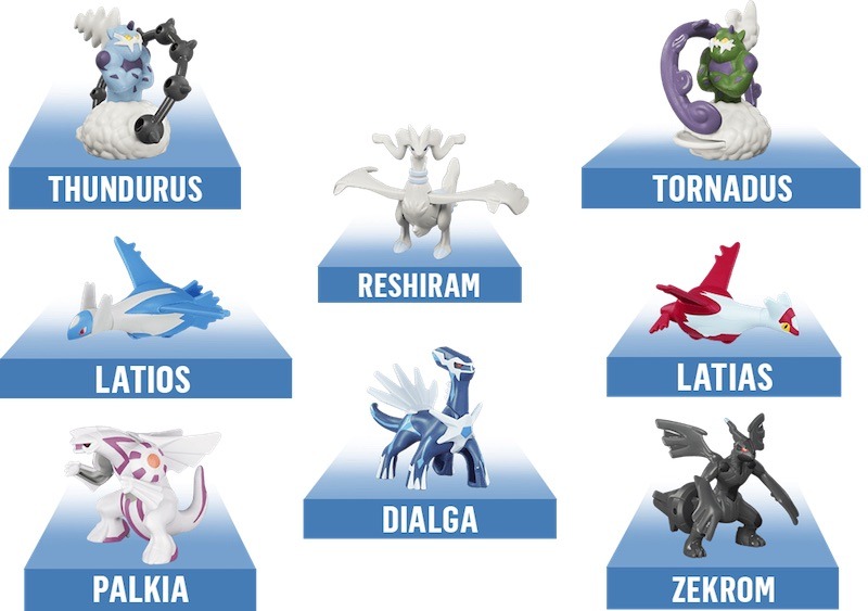 Da venerdì 9 novembre a giovedì 13 dicembre, come sorprese degli Happy Meal, saranno disponibili le statuette di otto Pokémon leggendari dedicate a Dialga, Palkia, Reshiram, Zekrom, Thundurus, Tornadus, Latios e Latias.