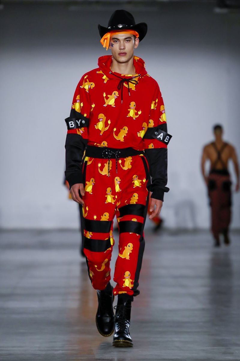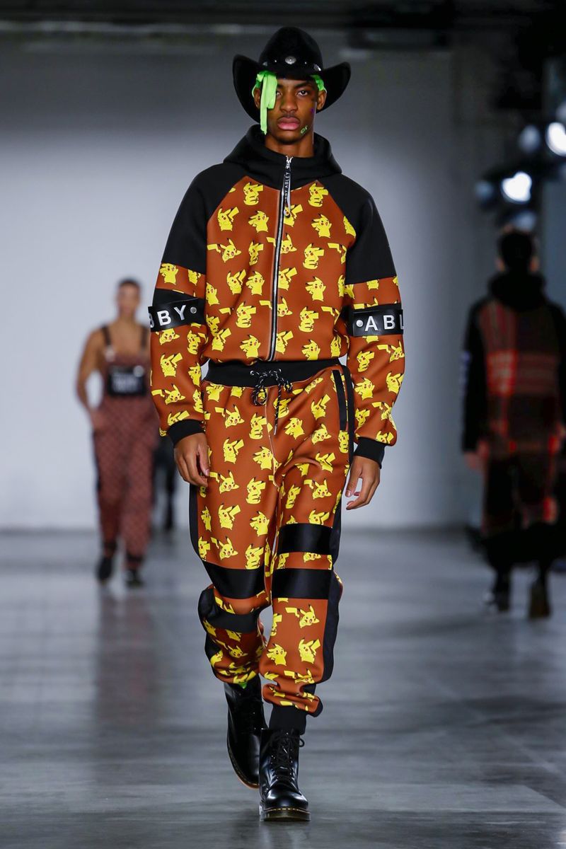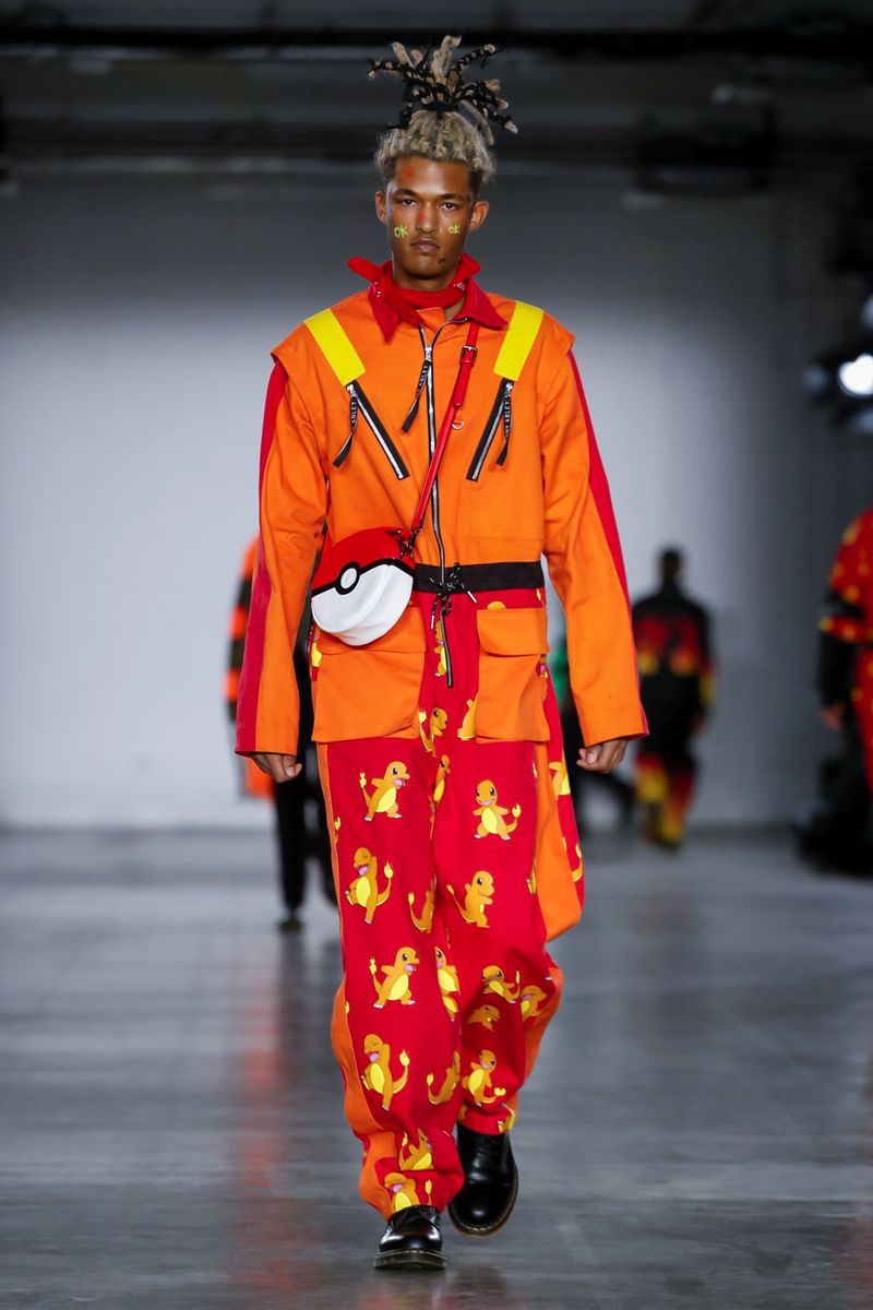 Ecco quindi che Bobby Abley mostra una serie di abiti dai colori sgargianti, richiamando Pokémon appartenenti alla prima generazione (indubbiamente i più celebri), ma anche elementi più strettamente iconografici, come le Poké Ball. Alla fine della sfilata, per suggellare il legame con i mostriciattoli tascabili, lo stesso stilista ha camminato lungo la passerella accompagnato nientemeno che da una mascotte vestita da Pikachu. Più chiaro di così non si può!