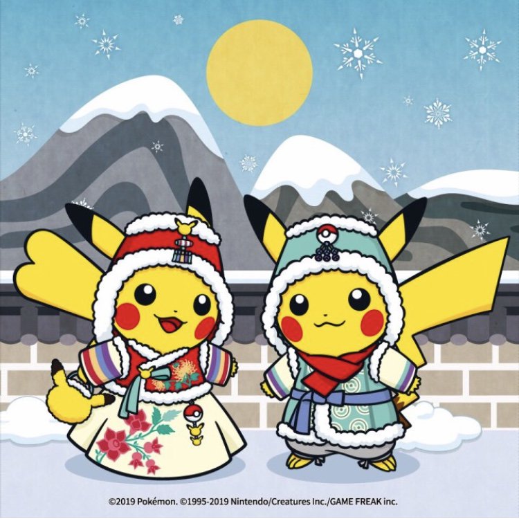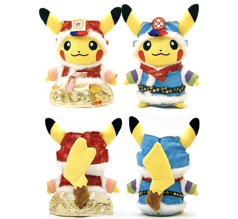 In questa nuova edizione la celebre mascotte gialla indossa un Hanbok, il vestito tradizionale coreano utilizzato nelle cerimonie o in occasioni importanti. L’annuncio dei peluche è avvenuto attraverso un disegno, nel quale sono ritratti due Pikachu: il maschio ha un Hanbok dai toni principalmente azzurri, mente la femmina indossa un vestito composto da un abito rosso con maniche arcobaleno e da una gonna dorata.