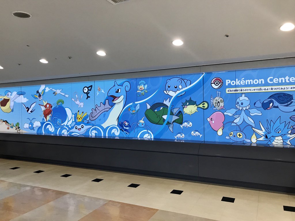 Il più eclatante riguarda la lunga parete che collega il centro commerciale SOGO al Pokémon Center. Questa infatti è stata decorata con una serie di pannelli raffiguranti un gran numero di Pokémon acquatici e non, intenti ad affollare spiaggia e mare di una località balneare. Ricordiamo infatti che alla base di questo progetto c’è il tema dell’oceano, come testimonia il gigantesco Kyogre che fa capolino dal soffitto del negozio.
