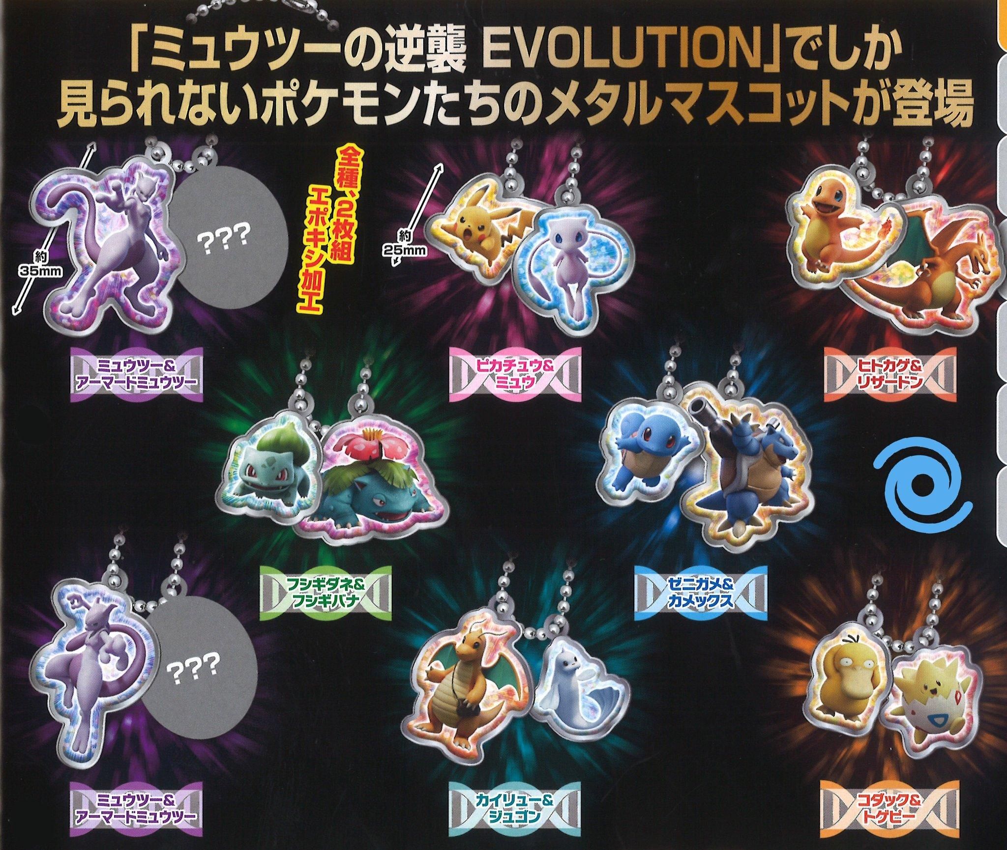 In una serie di portachiavi, chiamata PokéMetal Mascot EX e che sarà venduta a partire da giugno 2019, possiamo notare tanti Pokémon che prenderanno parte al film. In ogni singolo portachiavi si troveranno due ciondoli raffiguranti i nostri simpatici amici. Possiamo vedere l’iconico Dragonite postino insieme a Dewgong, Pikachu con Mew, Psyduck con Togepi e i tre starter di prima generazione insieme alle loro evoluzioni finali. E poi c’è Mewtwo.
