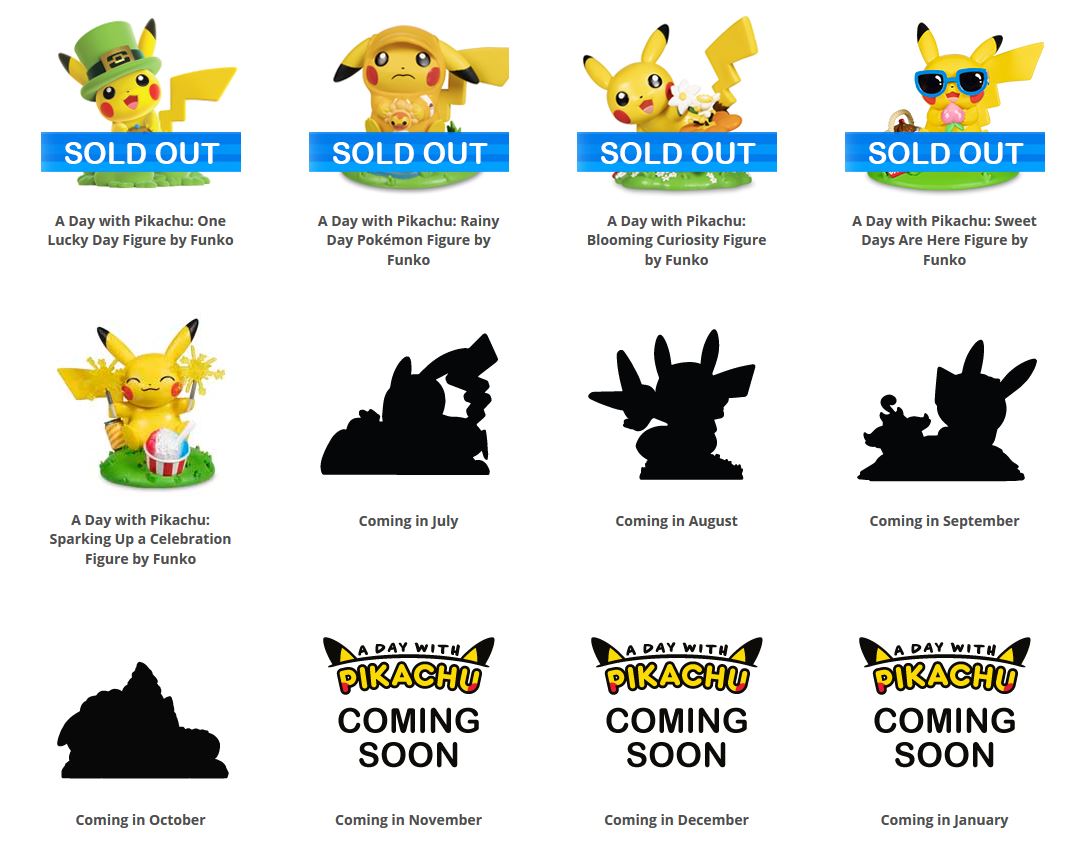 Questa serie di statuette Funko denominata A Day With Pikachu è stata inaugurata lo scorso febbraio con una figure dedicata a San Patrizio e proseguirà per un anno intero, fino a gennaio 2020. Ecco l’elenco delle statuette in uscita nei prossimi mesi: