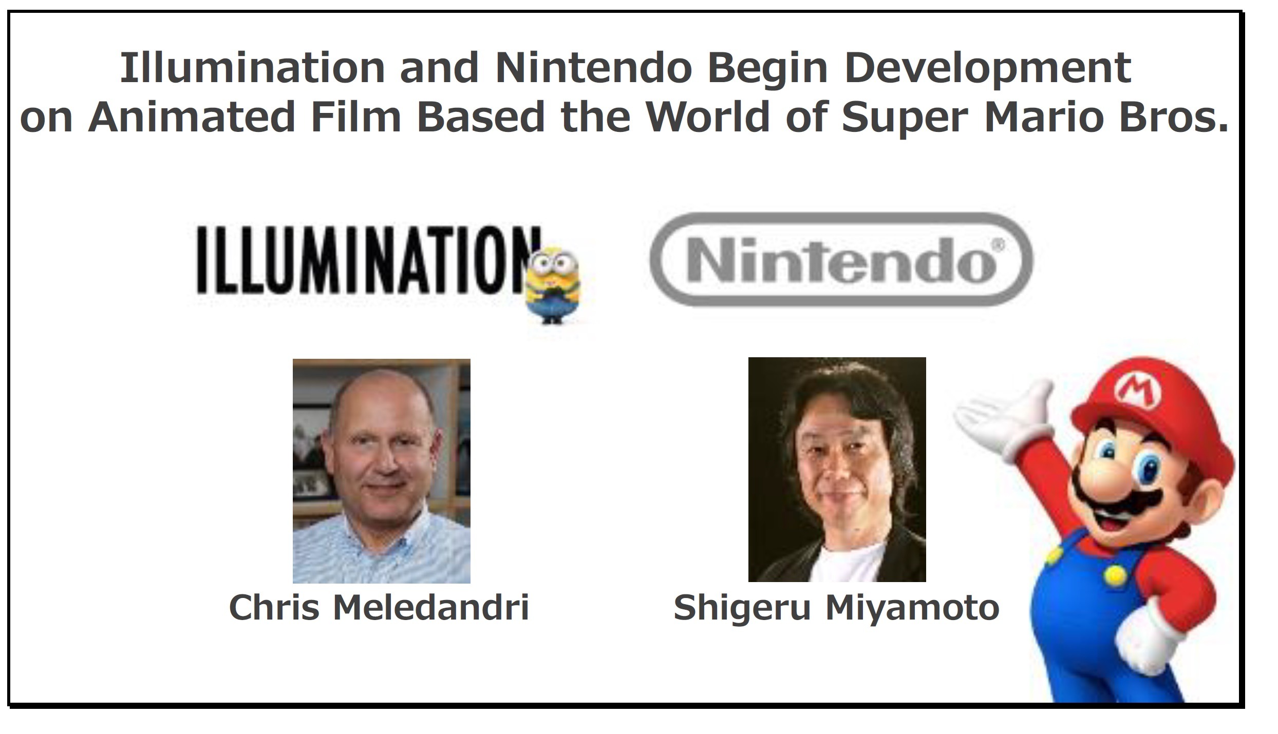 Miyamoto: Quando abbiamo cominciato la nostra collaborazione con Universal, ho sentito che il CEO di Illumination, Chris Meledandri, voleva incontrarmi; egli era anche in collaborazione con Universal. Allora ci siamo incontrati e abbiamo parlato. Lui disse alcune cose che io stesso avevo menzionato in interviste passate che il nostro modo di pensare è uno e uno solo.