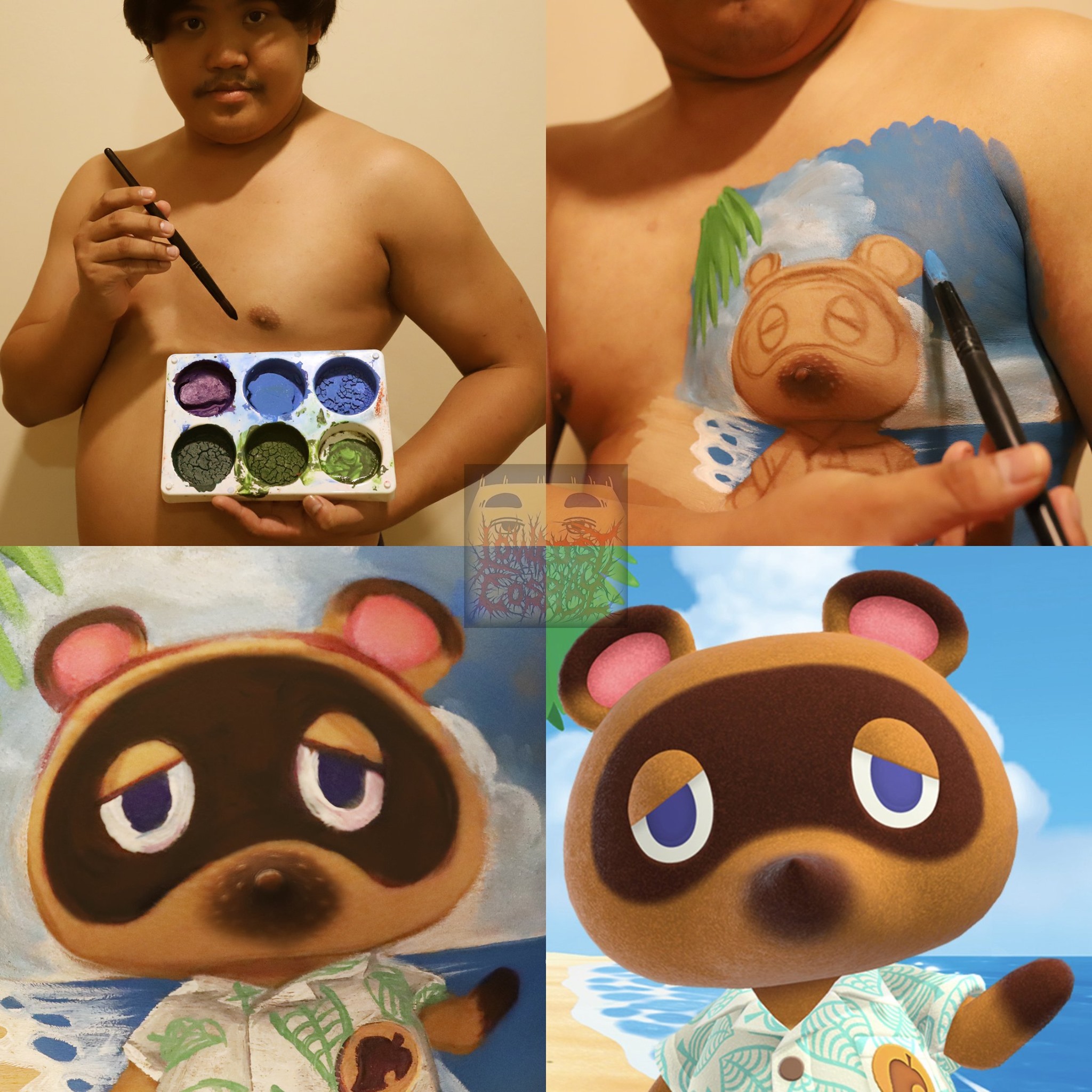 Lowcostcosplay ha dipinto uno sfondo e, davanti ad esso, Tom Nook, facendo sì che il suo naso coincidesse con il suo capezzolo.