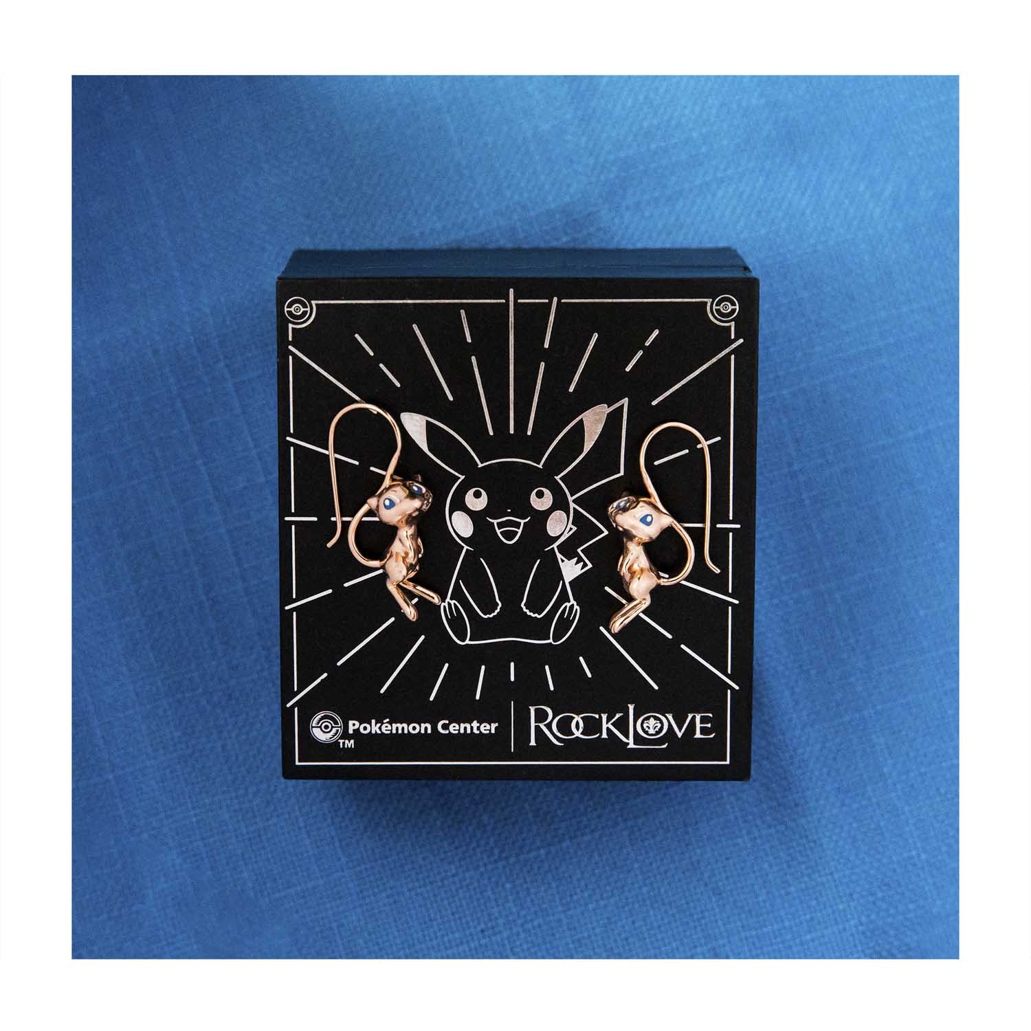 Gli orecchini sono composti degli stessi materiali della collana, ma sono lunghi 20 mm. Questa coppia di pendenti sfrutta la coda del Pokémon come gancio francese dando l’impressione che Mew stia fluttuando, appeso ai lobi delle orecchie. Anche la scatola Pokémon Center x RockLove, nera con Pikachu e altri dettagli rose-gold, impreziosisce questi gioielli.