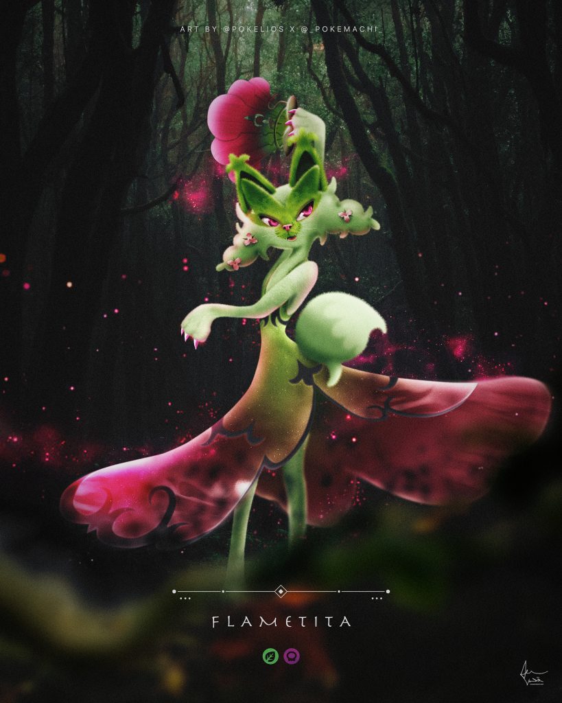 Il primo ha il nome di Flametita, evoluzione finale di Sprigatito di Tipo Erba/Veleno. Ideato da pokemachi, è ispirato ai ballerini di flamenco, come si può intuire dal nome. Il suo corpo è naturalmente un’abito tipico dell’Andalusia, aderente fino alla vita e con una gonna leggera che termina con delle balze. Il tocco di classe è quel ventaglio nella zampa destra, che dà un tocco di dinamicità.
