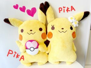 Gli stupendi peluche Pikachu, che al momento sono un’esclusiva del mercato nipponico, sono prodotti appartenenti ad una particolare linea – “Pikachu adorabili” – di cui fanno parte anche peluche più piccoli, ciabatte e portachiavi peluche. Pikachu maschio e Pikachu femmina sono gli articoli più costosi: grandi ben 72 centimetri di altezza e 42 di larghezza, questi adorabile splendori possono essere acquistati per 8.000 yen (circa 62,80 euro) l’uno!