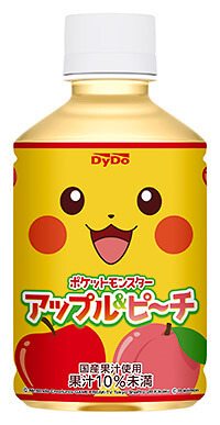 A partire da lunedì 3 ottobre sono divenute disponibili delle particolarissime bottigliette da 280 ml di succo di frutta al gusto di mela e pesca! Le bottigliette, decorate con tre diverse immagini di Pikachu, potranno essere acquistate nei distributori DyDo giapponesi per 115 yen (circa 1,00 euro) l’una.