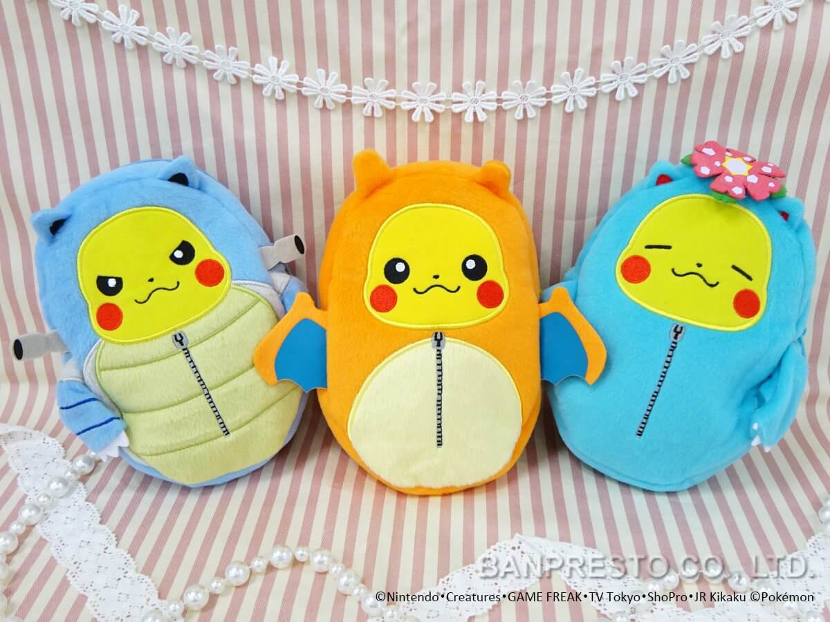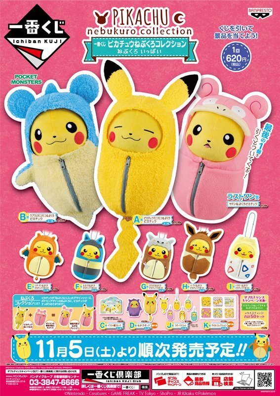 Infine, a partire da sabato 5 novembre, diventeranno disponibili nuovi design per la collezione dei “Pikachu sacco a pelo”! Nuovi pupazzi Pikachu e nuovi sacco a pelo saranno acquistabili per 620 yen (circa 5,40 euro) al pezzo e combinabili tra loro per creare peluche sempre nuovi!