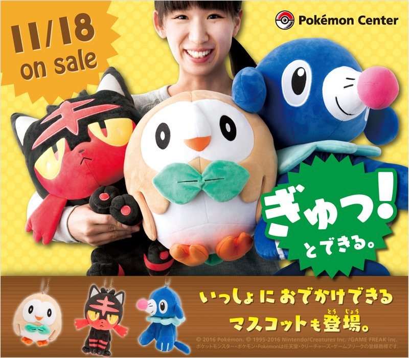 Il giorno di lancio di Pokémon Sole e Luna si avvicina… e non solo! A partire da venerdì 18 novembre sarà possibile acquistare anche nuova merce dedicata ai due giochi! Nello specifico, sarà possibile acquistare per 1.500 yen (circa 13,10 euro) i peluche di Vulpix Forma di Alola, Rockruff, Pikipek, Komala; i peluche a grandezza naturale dei Pokémon iniziali, acquistabili per 4.800 yen (circa 41,90 euro) l’uno; le mascotte a loro dedicate acquistabili per 1.000 yen (circa 8,70 euro) l’una.