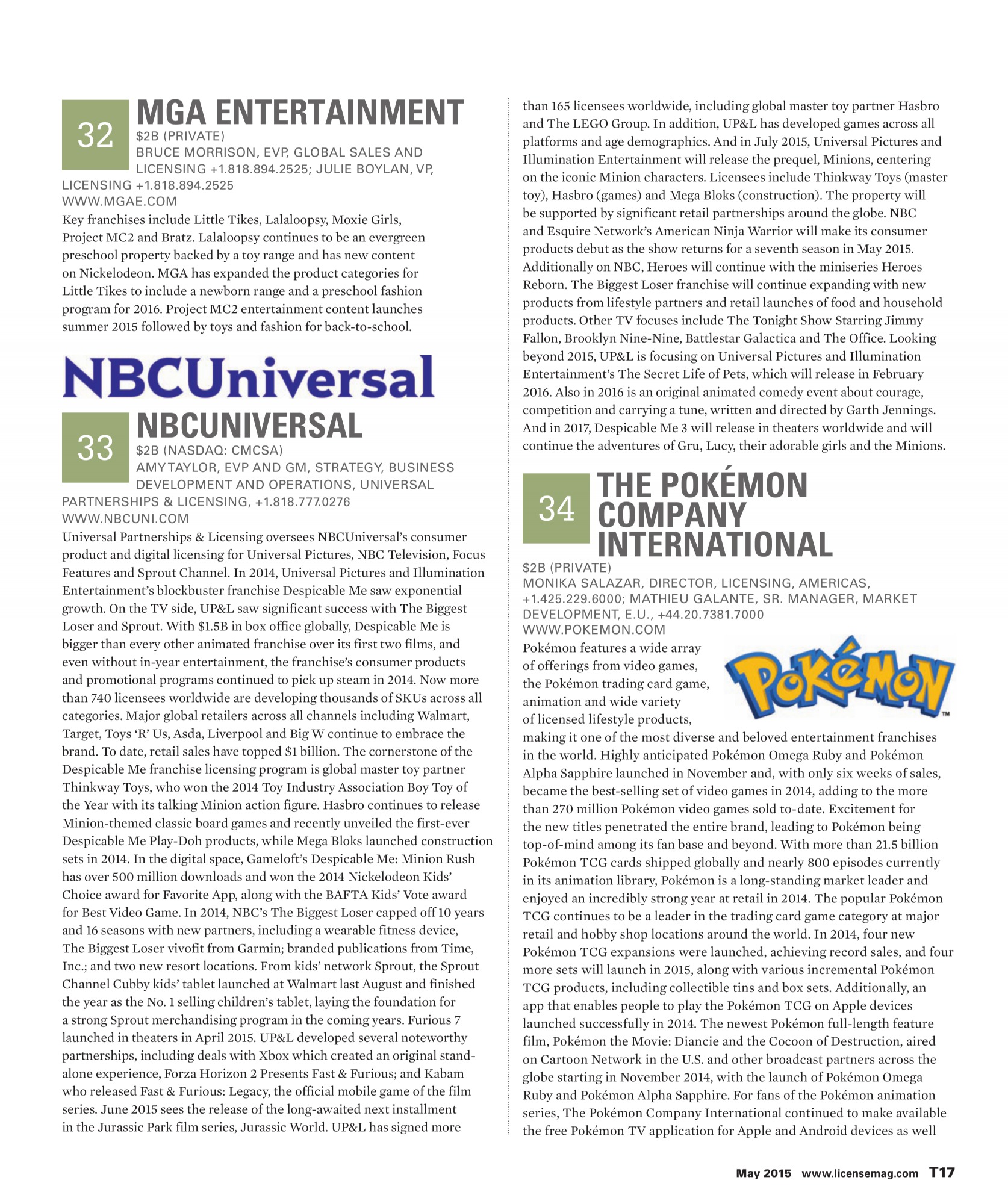 Secondo i dati rilasciati da License Global!, sito che si occupa di ricevere i dati di vendita delle più grandi aziende a livello internazionale, The Pokémon Company Internation nel corso 2014 è riuscita a guadagnare circa 2 miliardi di dollari grazie alla vendita di videogiochi, carte per il Gioco di Carte Collezionabili, gadget e tutto ciò che è inerente al marchio dei mostriciattoli tascabili.