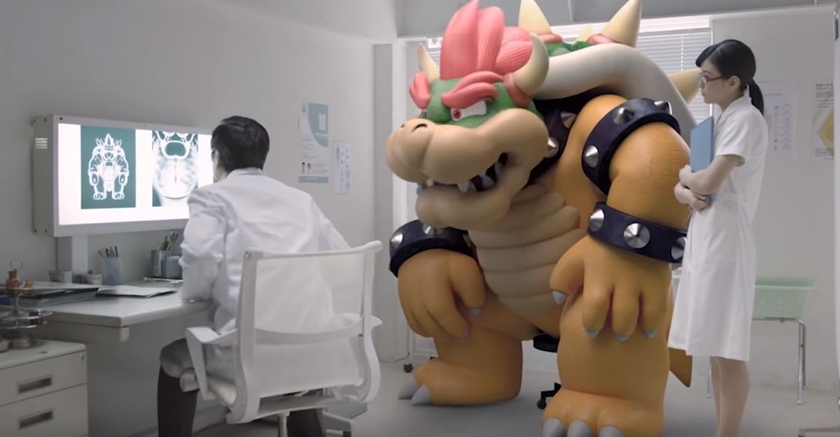 L’introduzione del video vede protagonista un attonito Bowser in CGI dentro uno studio medico, intento a contemplare una propria radiografia nella quale si vedono Mario e Luigi dispersi in qualche punto del suo stomaco(?). Sì, perché tutto è cominciato con un fungo velenoso che il Signore dei Koopa, indotto da uno spregevole mercante, ha ingurgitato, convinto che sarebbe finalmente riuscito a sconfiggere Mario. L’effetto collaterale di questa bravata è il motivo per cui si trova dal dottore: Bowser ha cominciato a risucchiare tutto ciò che gli è capitato a tiro, compresi i Mario Bros. e l’onnipresente Principessa Peach. Il tutto mentre si scopre che lo stesso fungo è la causa dell’epidemia di Gravitombolite che imperversa in tutta Fungopoli, a causa della quale i Toad si gonfiano a dismisura.