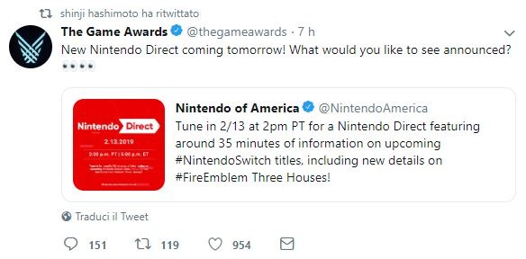 Shinji Hashimoto, produttore di videogiochi della Square Enix, ha ritwittato l’annuncio del Nintendo Direct di Nintendo of America, a sua volta citato dal profilo ufficiale di The Game Awards. Questa semplice interazione social potrebbe significare la presenza di uno o più titoli della società giapponese tra i videogiochi che verranno mostrati nella diretta del 13 febbraio, alle 23.