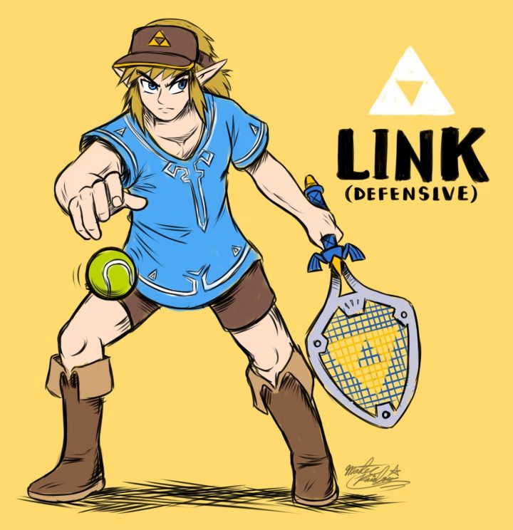 Link viene immaginato come un giocatore di tipo difensivo, con un costume che ricalca a piene mani quello da lui indossato nell’acclamatissimo ultimo titolo The Legend of Zelda: Breath of the Wild. Stando alla descrizione fornita dall’autore di questa particolare fan art, sarebbe stato impossibile ritrarlo con delle scarpe sportive qualsiasi, pertanto anche in questa occasione egli indossa i suoi iconici stivali. La racchetta ricalca il design del suo fedele scudo, ma l’impugnatura è quella della Master Sword.