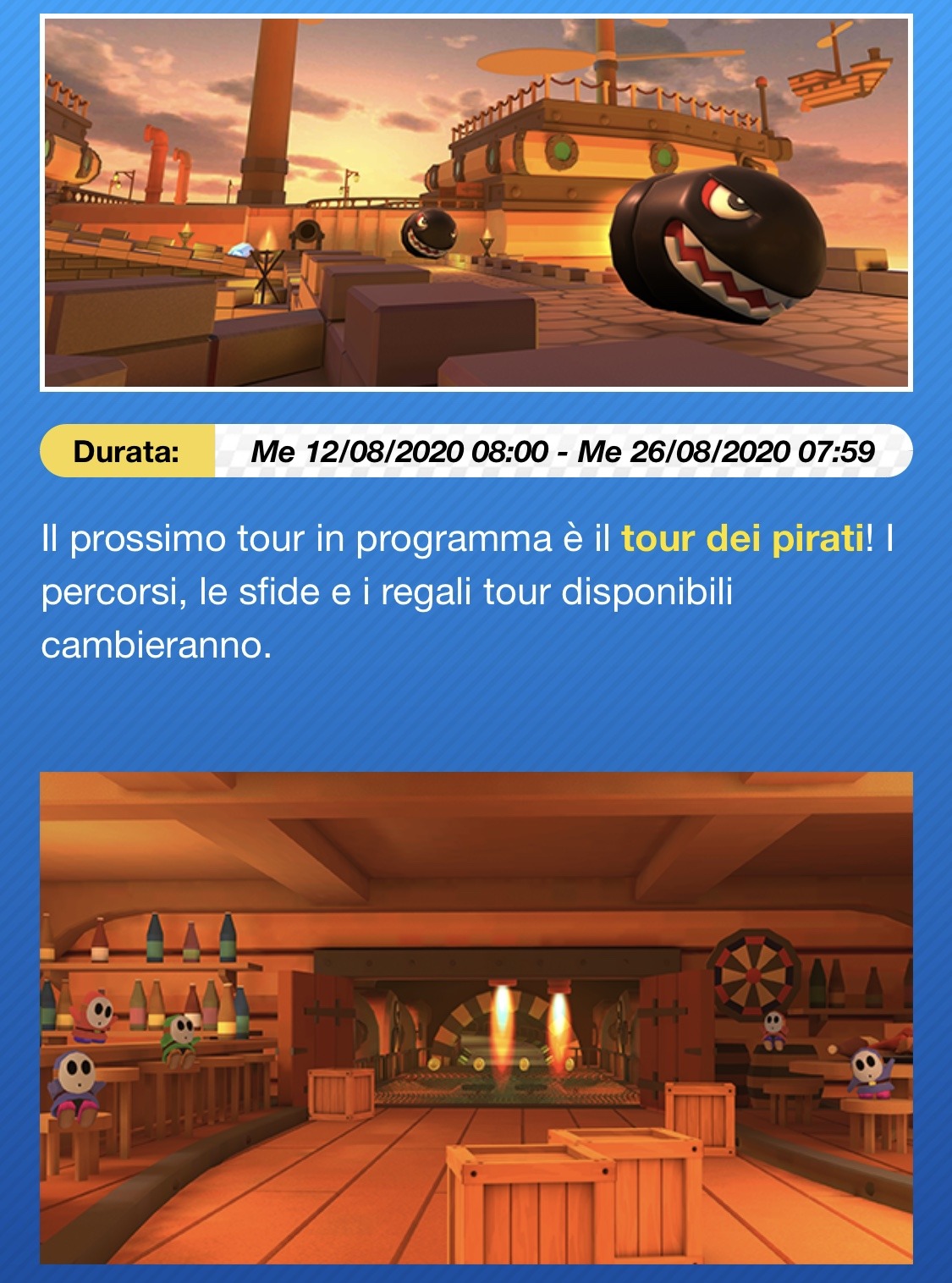 A partire da mercoledì 12 agosto alle ore 8:00 e fino al 26 agosto 2020 alle 7:59, sarà possibile affrontare il nuovo tour dei pirati nell’app di Mario Kart Tour. Al temine del corrente evento dedicato al selvaggio West, i nostri piloti dovranno tuffarsi tra mari in tempesta, velieri ricchi di insidie e colpi di cannone.