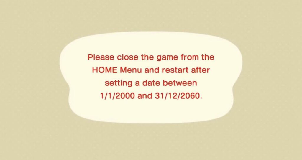 “Si prega di chiudere il gioco dal menù Home e riavviarlo dopo aver impostato una data tra l’1/1/2000 e il 31/12/2060.”
